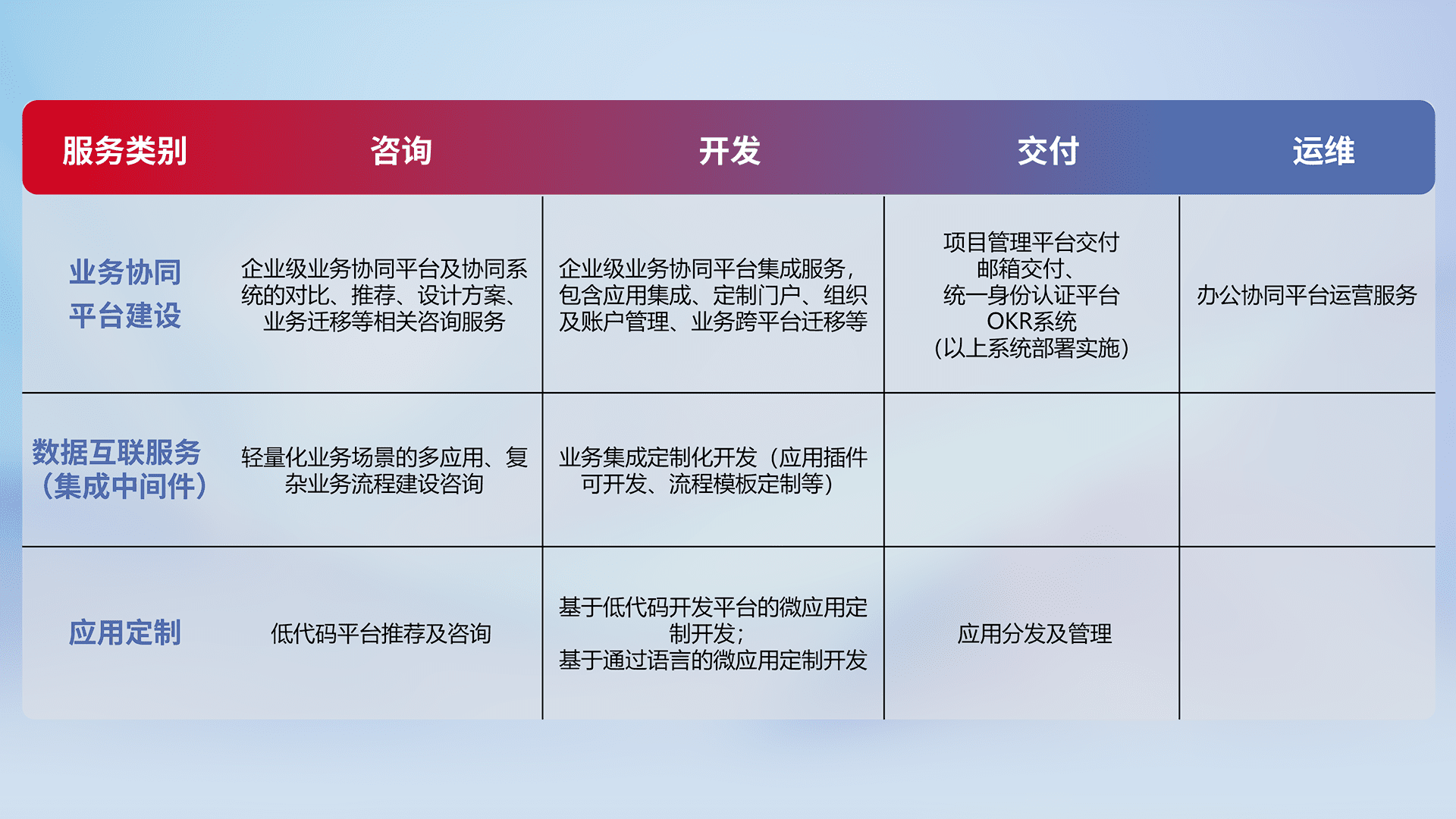 针对钉钉、、、、企微、、、、IDaas等平台级产品提供产品的规划、、、方案、、、交付、、、定制化开发等服务,,实现如统一协同办公、、智能客户服务、、混合会议管理、、、、智能数据查询、、、、等业务场景,,实现数字化转型。。。
