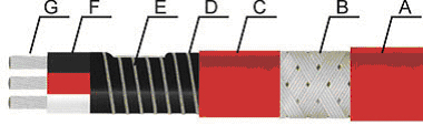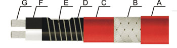 D-骨架层  E-镍铬合金丝(发热丝)  F-芯线绝缘层FEP   G-芯线(镀锡铜绞线)