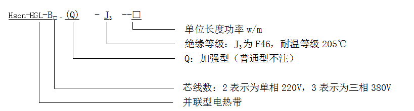 例:Hson-HGL-B2-J3-40           其绝缘材料为F46氟塑料,,单相普通型恒功率电伴热带,,,,功率为40w/m。。。。